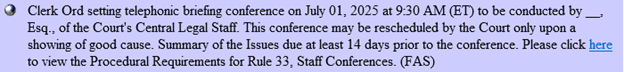 The Court's scheduling order is issued as an entry on the docket with notice to the parties. The entry (1) identifies the conference date and time; (2) identifies the CLS staff attorney assigned to conduct the mediation; and (3) notifies the parties that (a) the Staff Conference may be rescheduled by the Court only upon a showing of good cause and (b) the Summary of the Issues is due at least 14 days prior to the conference. In addition, the docket entry provides a link to the Court's Rule 33 and a link to these Procedural Requirements. Below is an example of the Court's scheduling order for a particular case: